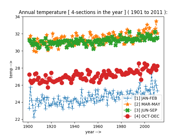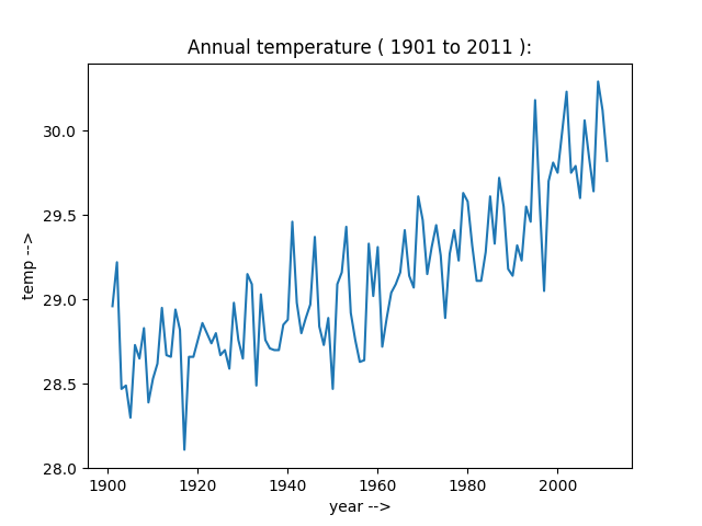 Data DescriptionThis time series is based on the surface air temperature (1.2 m above sea level) data from more than 350 stations spread over the country.The time series shows a warming over India during the recent years. |